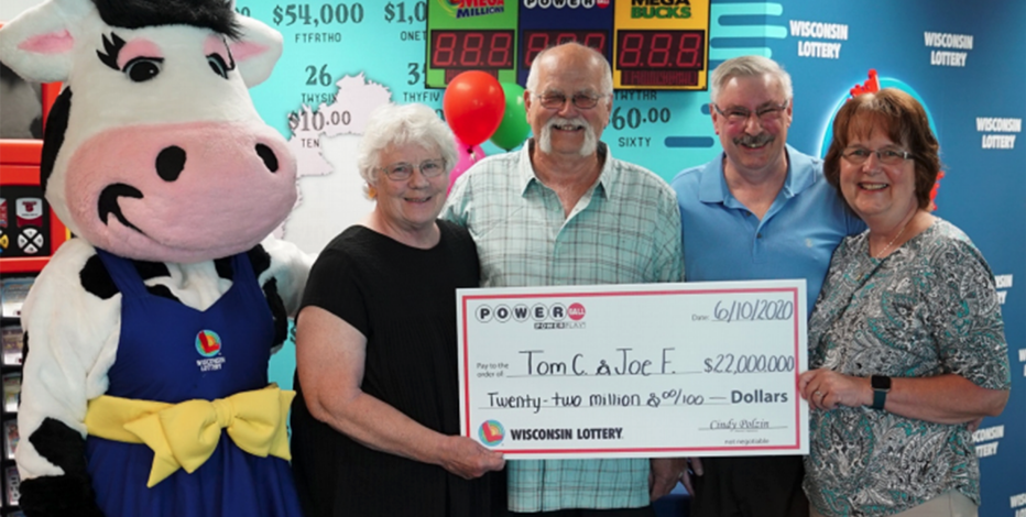 Tim Cook, Joe Feeney and their wives, collecting the prize-winning check (Wisconsin Lottery)