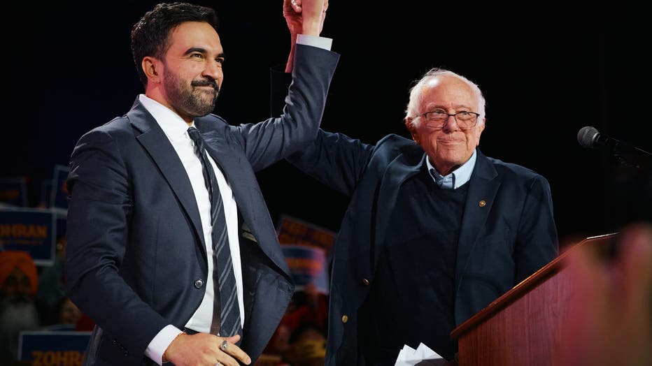 NEW YORK, NEW YORK - OCTOBER 26: New York Mayoral Candidate Zohran Mamdani celebrates with Sen. Bernie Sanders (I-VT) during an election rally with Sanders and U.S. Rep. Alexandria Ocasio-Cortez (D-NY) at Forest Hills Stadium on October 26, 2025 in t