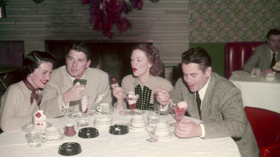 American actor Ronald Reagan (1911 - 2004) and his second wife, actress Nancy Davis (1921 - 2016), eating ice cream sundaes with actors Eleanor Powell and her husband, actor Glenn Ford (the couple on the right), circa 1953. (Photo by Silver Screen Co