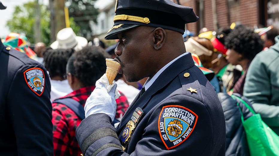 NEW YORK, NEW YORK - JUNE 01: Correction Officer eats ice cream as he joins others in participating in the annual Guyana Independence Parade in Brooklyn on June 01, 2025 in New York City. This year’s parade, which also includes an afternoon of food a