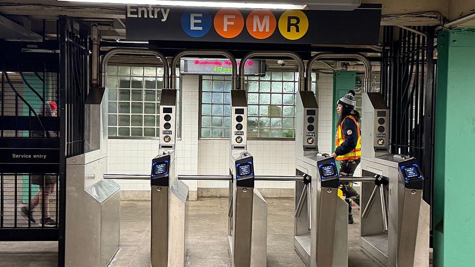 MTA subway station OMNY turnstile entrance for E, F, M & R trains, Queens, New York. (Photo by: Lindsey Nicholson/UCG/Universal Images Group via Getty Images)