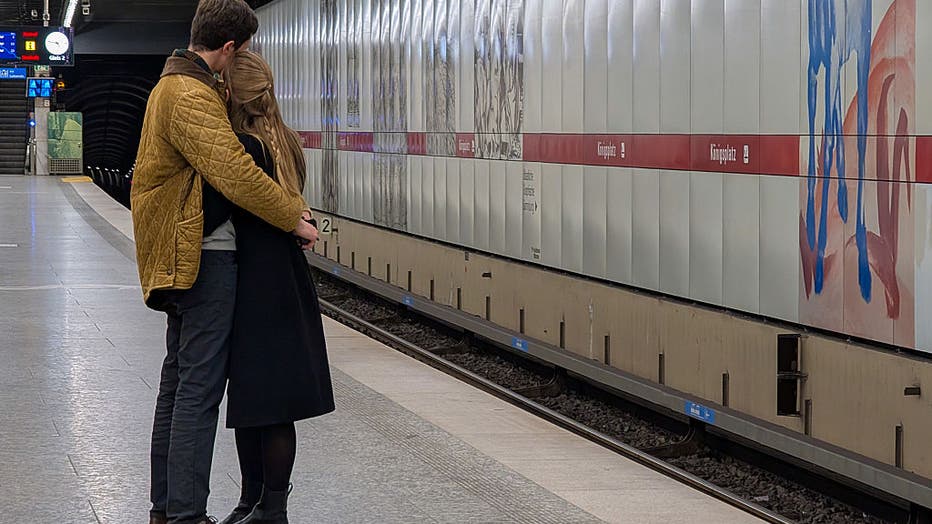 A young couple embraces while waiting on the subway platform at Koenigsplatz station in Munich, Germany, on May 18, 2025. The quiet moment of affection takes place in the underground metro station decorated with classical wall art. (Photo by Michael