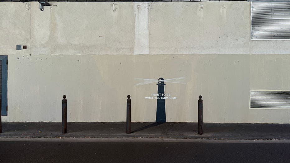 This photograph shows a newly released artwork depicting a lighthouse, by street artist Banksy on the facade of a building in Marseille, southeastern France, on May 30, 2025. (Photo by VIKEN KANTARCI/AFP via Getty Images)