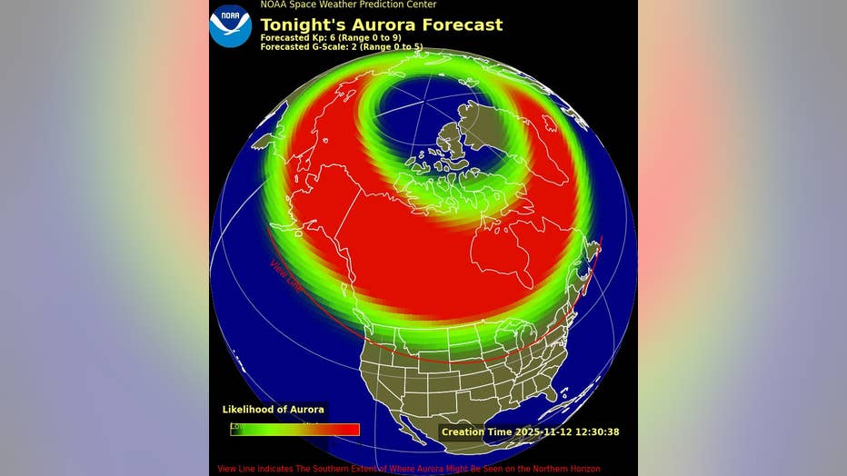 The latest forecast from NOAA’s Space Weather Prediction Center shows the auroral "viewline" hovering just north of New York, meaning that if the geomagnetic storm intensifies, residents of upstate New York or northwestern New Jersey could catch a faint glow low on the horizon.