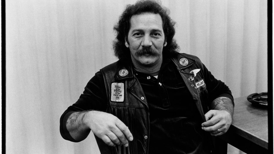Portrait of American biker and founding member of the Oakland chapter of the Hells Angels Sonny Barger (born Ralph Barger) as he sits at a table, San Francisco, California, January 1979. (Photo by Janet Fries/Getty Images)