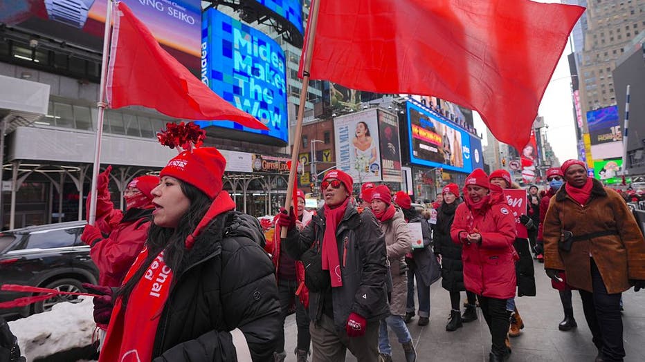 NEW YORK, UNITED STATES - FEBRUARY 6: New York City nurses, who are in a month-long strike in sub-freezing temperatures, flood Times Square to demand safe staffing levels, enhanced protection against workplace violence, and fair wages to keep up with