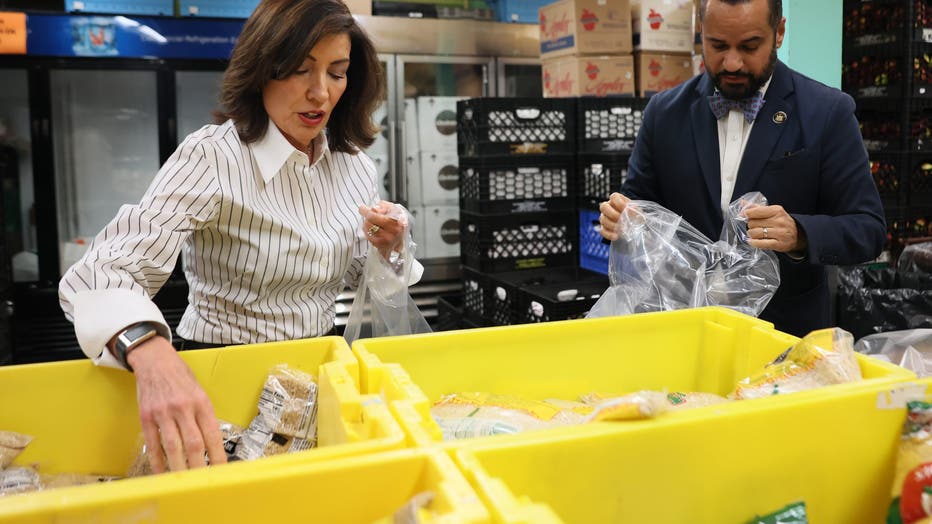 NEW YORK, NEW YORK - OCTOBER 30: New York Gov. Kathy Hochul and State Senator Jose Serrano help to package food before a press conference at New York Common Pantry on October 30, 2025 in New York City. Gov. Hochul was joined by members of local gover