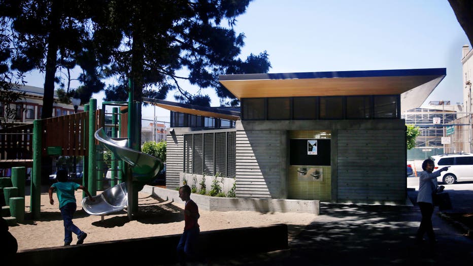 The new bathroom building in Washington Square Park with shingled concrete wall and a cantilevered roof with wood trim is seen on Friday, May 8, 2015 in San Francisco, Calif. (Photo By Lea Suzuki/The San Francisco Chronicle via Getty Images)
