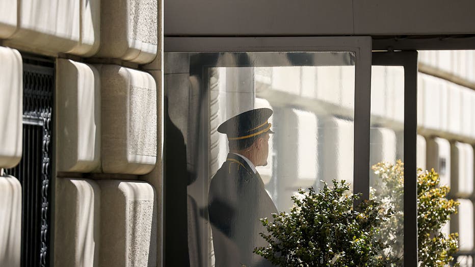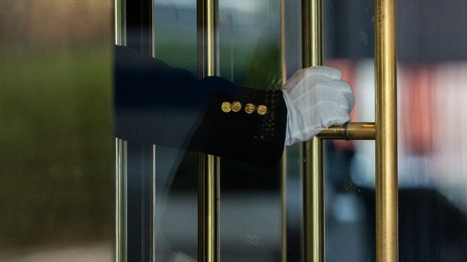A doorman opens a door in New York, U.S., on Wednesday, April 20, 2022. New York City residents at more than 3,000 buildings, including the citys most grand high-rises, can stand down on trash duty as building workers struck a labor deal, ending the