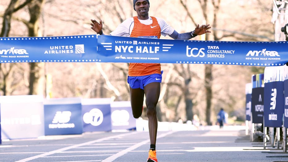 NEW YORK, NY - MARCH 19: Jacob Kiplimo of Uganda crosses the finish line to win the Mens United Airlines NYC Half Marathon on March 19, 2023 in New York City. (Photo by Rich Schultz/Getty Images)