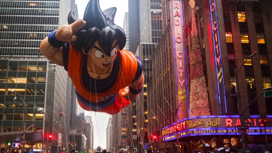 TOPSHOT - The Goku, from Dragon Ball, balloon floats during the annual Macy's Thanksgiving Day Parade in New York City on November 28, 2024. (Photo by CHARLY TRIBALLEAU / AFP) (Photo by CHARLY TRIBALLEAU/AFP via Getty Images)