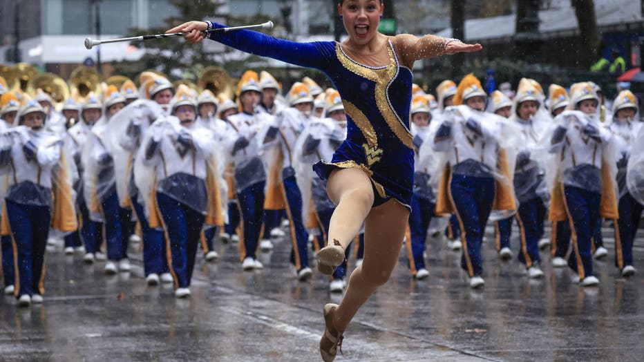 NEW YORK, NEW YORK - NOVEMBER 28: A participant jumps during the Annual Thanksgiving Day Parade on November 28, 2024 in New York City. (Photo by Kena Betancur/Getty Images)