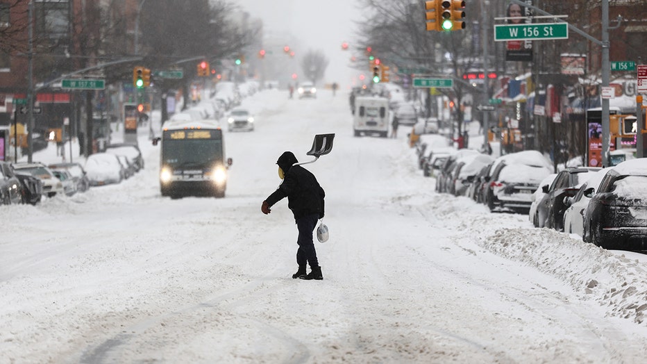 A man carries a shovel as he crosses a street in the Hamilton Heights neighborhood in New York on January 25, 2026. (Photo by CHARLY TRIBALLEAU / AFP via Getty Images)