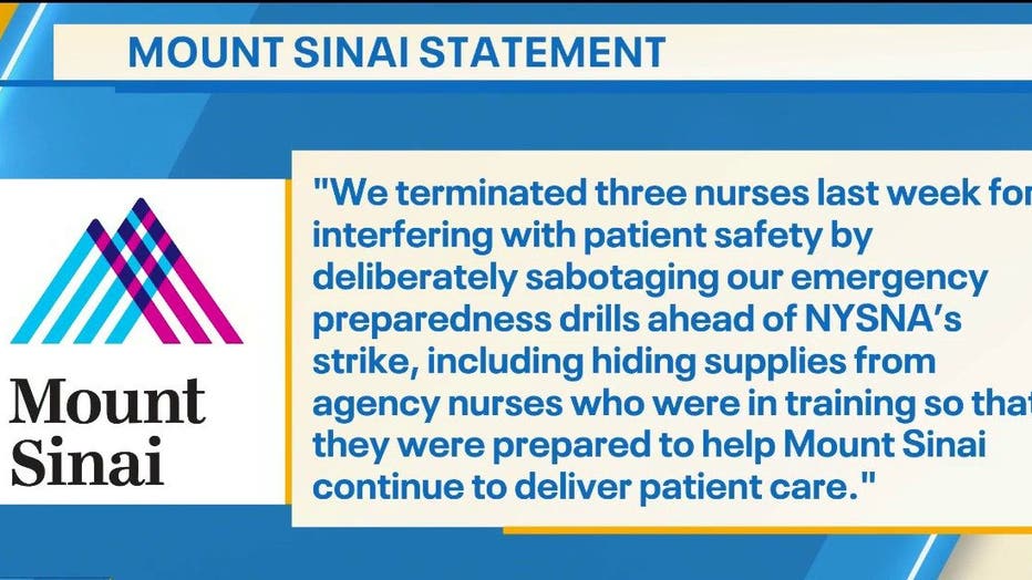 In a statement, Mount Sinai said it terminated the nurses for "deliberately sabotaging emergency preparedness drills ahead of the strike," including hiding medical supplies from agency nurses who were training to cover patient care during the walkout. The hospital says security footage supports its claims.