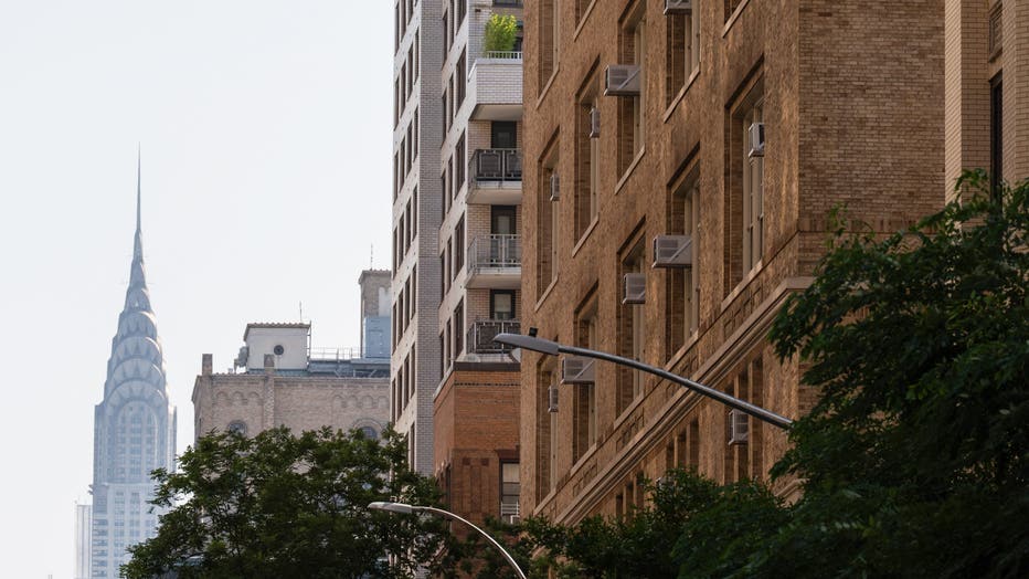 The Chrysler Building behind air conditioning units installed in windows during high temperatures in New York, US, on Monday, June 23, 2025. In addition to posing health risks, the blistering weather will boost electricity demand and strain aging tra