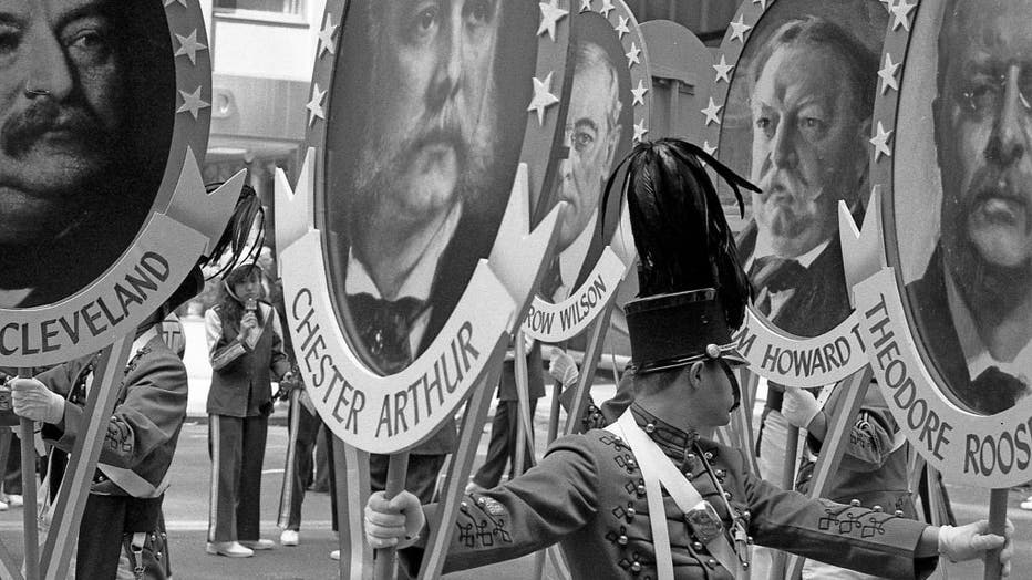 View of marchers on Water Street holding placards with portraits of various US presidents during the bicentennial presidential parade, New York, New York, April 30, 1989. Pictured are, from left, Grover Cleveland (partially visible), Chester Arthur,