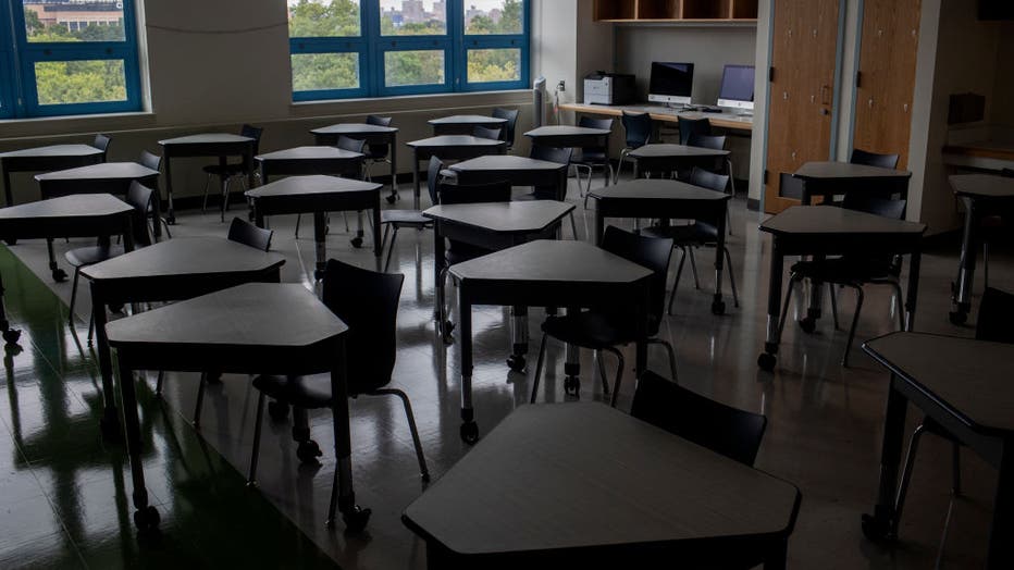 QUEENS, NEW YORK: An empty classroom is part of the preparation for the return of in-person learning at Public School 143. (Photo by Andrew Lichtenstein/Corbis via Getty Images)