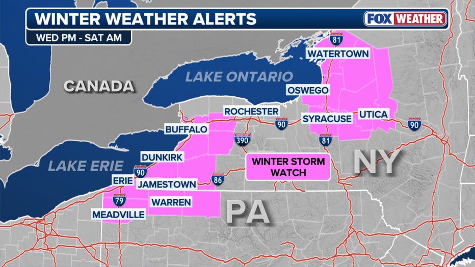 Winter Storm Watches are in effect for areas south of Buffalo, including Dunkirk and Jamestown, where a foot or more of snow could fall through Black Friday, according to the FOX Forecast Center.