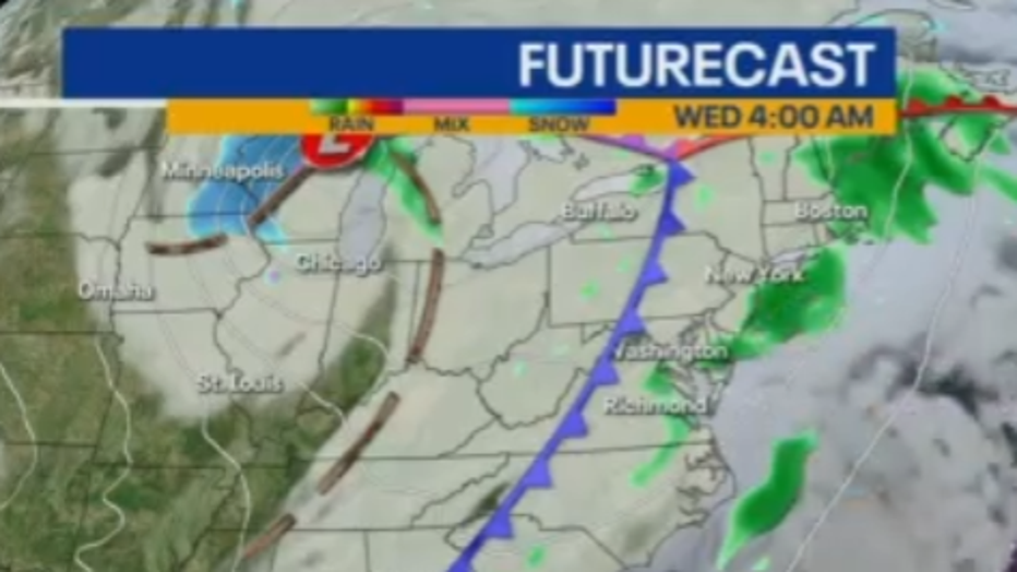 NEW YORK - The Thanksgiving travel rush is in full swing across the tri-state area, with mostly dry skies early Tuesday giving way to rain by mid-afternoon — and heavy snow setting up later this week for parts of upstate and western New York.
