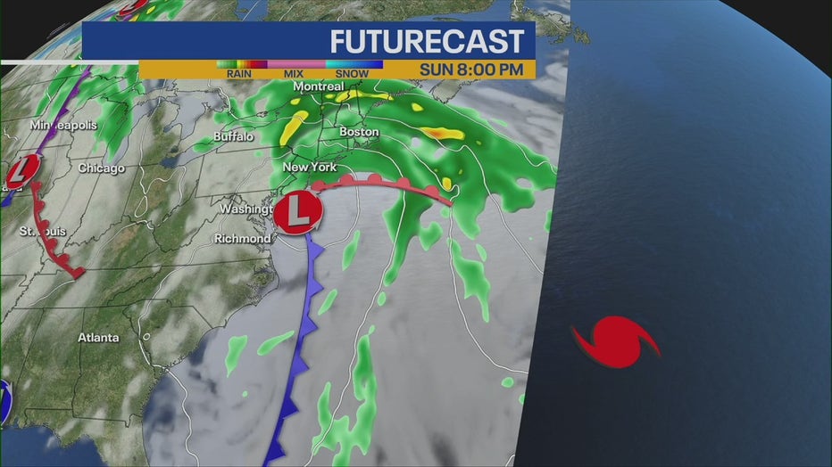 According to the FOX Forecast Center, rain closer to the coast looks to amount to a widespread 2-3 inches through Monday. Localized amounts closer to 3-5 inches are possible, with wind gusts of 30-50 mph possible along the Northeast coast through Sunday and into early Monday.