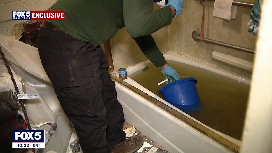 As FOX 5 NY crews were preparing to leave the building, the bathtub in Castillo’s apartment began filling with sewage again. Crews were seen using buckets to prevent it from overflowing.