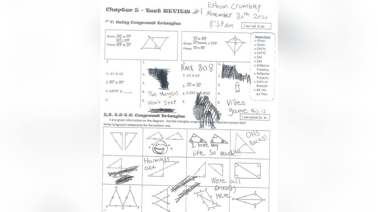 Officials said a teacher took a photo of the paper before Ethan Crumbley scribbled out some of the words and drawings. That teacher notified school administrators, who met with the teen and his parents shortly before the shooting.