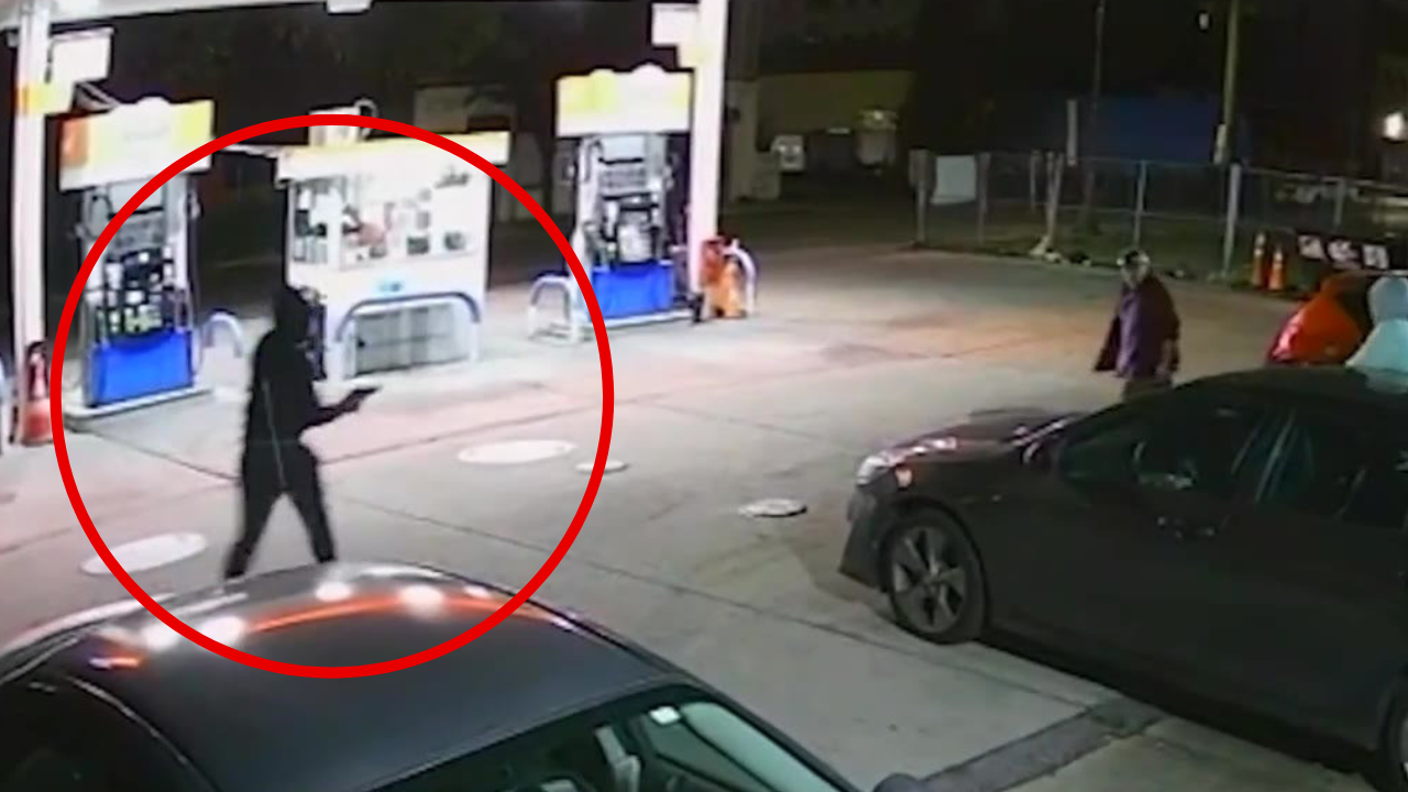 Surveillance video from the scene shows suspects at the gas station, with at least one holding a gun during the robbery attempt.