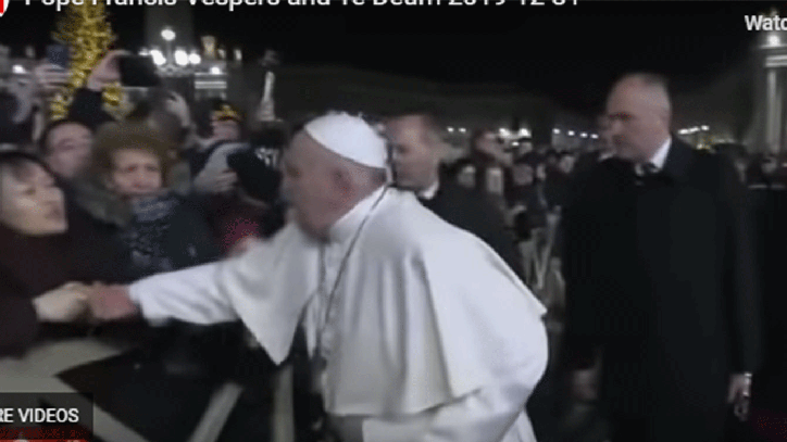 Cameras captured the scene when the woman, from behind a barrier, reached out and grabbed the pope's hand, pulling him violently toward her. Francis reacted sharply, exclaimed something and then slapped her hand so she would let him go. Frowning in anger, he turned and strode away.