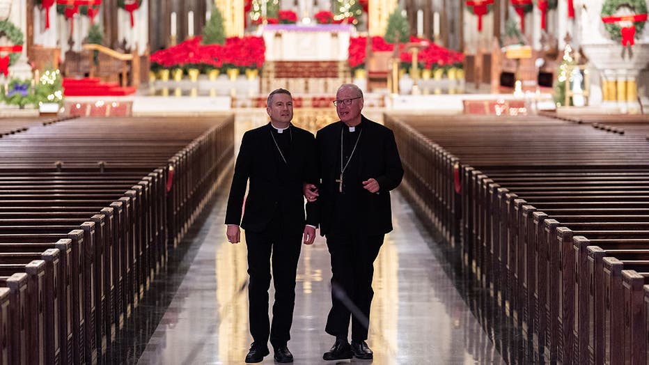 NEW YORK, NEW YORK - DECEMBER 18: Cardinal Dolan (R) and New York Archbishop-Designate Donald Hicks attend a press conference at St. Patricks Cathedral on December 18, 2025 in New York City. Hicks, known for his pro-migrant stance, spent five years i