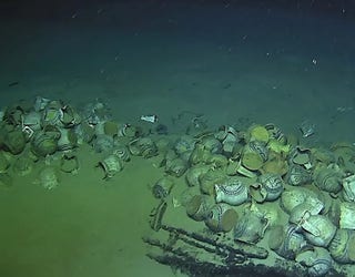 Photos from the site show what appears to be weathered wood protruding from the seabed, surrounded by dozens of ceramic vessels still in remarkably intact condition.