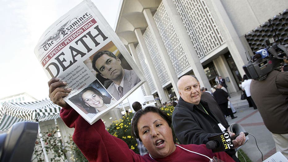 REDWOOD CITY, CA - DECEMBER 13: Edie Alejandre, a carrier for the San Francisco Examiner, hands out copies of the newspaper's special edition which headlines the sentence of death in the Scott Peterson Trial outside the San Mateo County Courthouse De