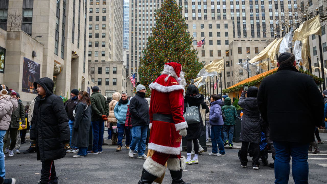 NEW YORK, NEW YORK - DECEMBER 25: A person dressed as Santa Claus working for tips waits for cusotmers near the the Rockfeller Christmas Tree on Christmas Day on December 25, 2024 in New York City. For the first time since 2005 the first night of Han
