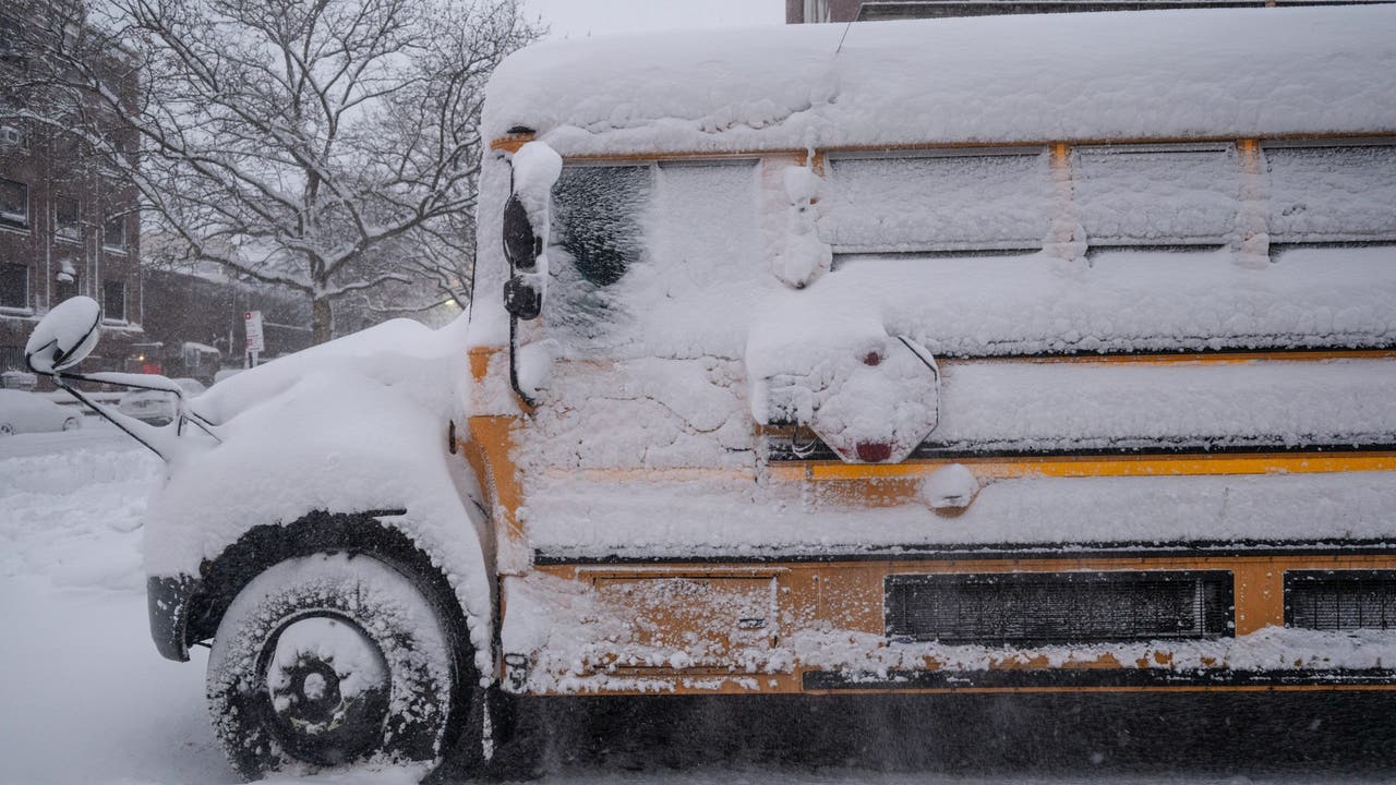 A school bus covered in snow during a winter storm in the Brooklyn borough of New York, US, on Monday, Feb. 23, 2026. A powerful winter storm has cut off New York City, grounding thousands of flights and straining transport networks, as 41 million pe