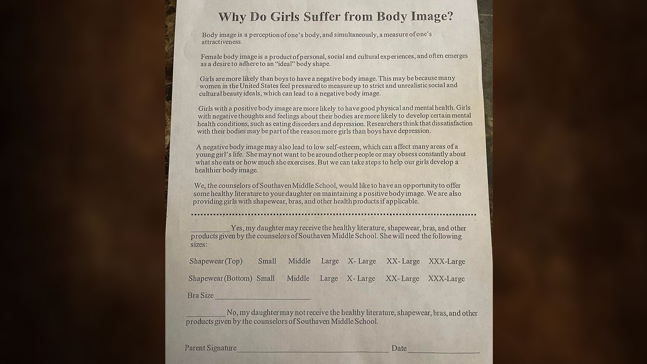 The letter continued: "We, the counselors of Southaven Middle School, would like to have an opportunity to offer some healthy literature to your daughter on maintaining a positive body image," the letter read. "We are also providing girls with shapewear, bras and other health products if applicable."