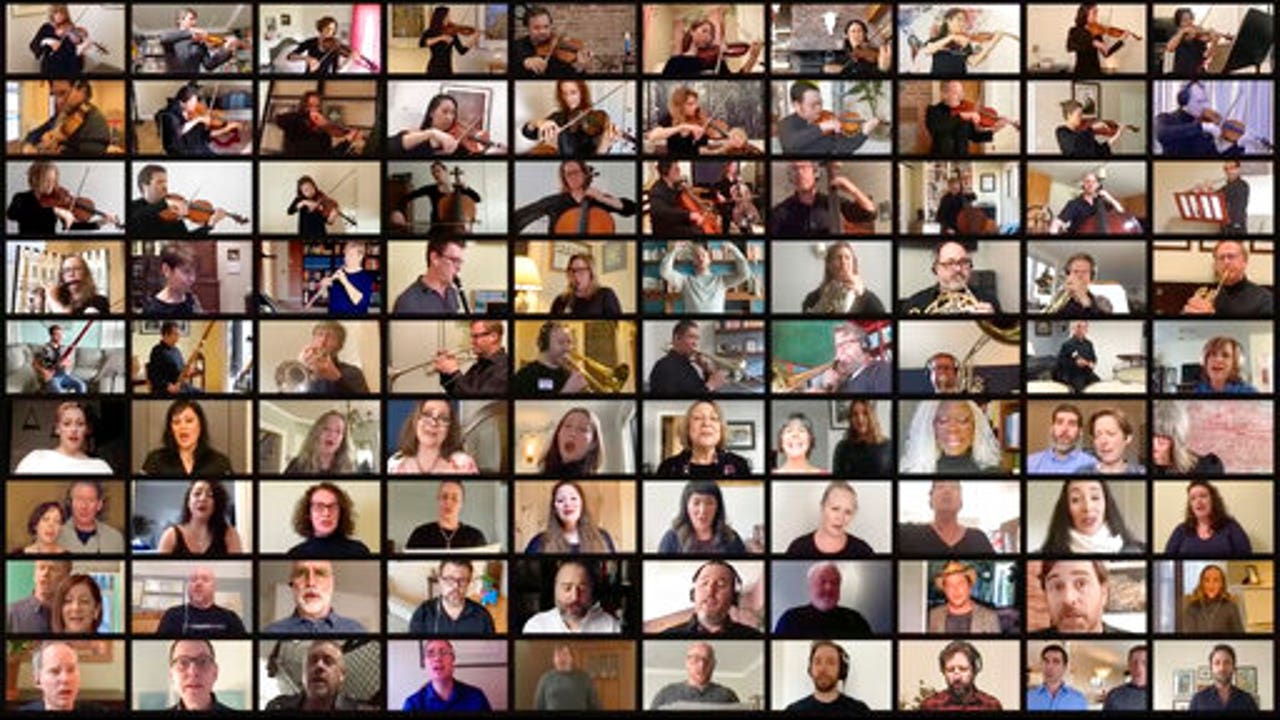 In a photo provided by the Metropolitan Opera, members of the Metropolitan Opera Orchestra and chorus performing from homes for the company’s At-Home gala, which was transmitted Saturday, April 25, 2020. Music director Yannick Nézet-Séguini in Mointr