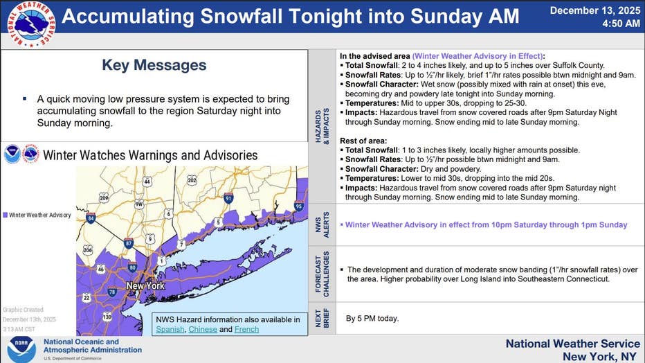 Projected accumulated snow totals across the NYC Metro area from Saturday, Dec. 13, 2025, to Sunday, Dec. 14, 2025. (Credit: National Weather Service)