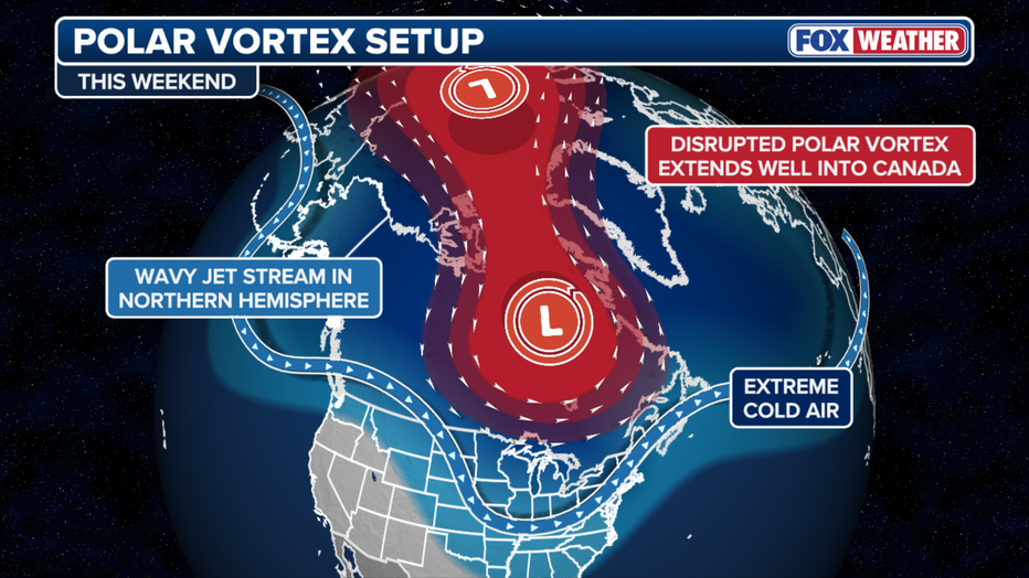 This graphic shows how a weak Polar Vortex allows cold air to spill over the U.S. (FOX Weather)