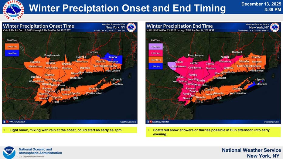 As of 3 p.m. on Saturday, the National Weather Service predicts that snow will start falling through NYC, northeastern New Jersey, Long Island and southern Connecticut around 10 p.m. on Dec. 13. Some areas further east in Connecticut might not see snow until about 1 a.m. on Sunday, Dec. 14.