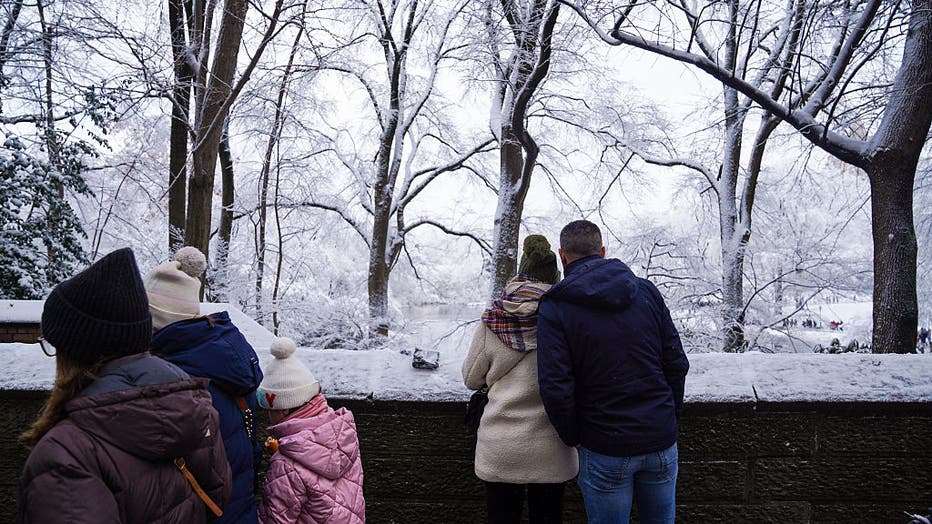 NEW YORK, NEW YORK - DECEMBER 14: People are seen enjoying the snow in Central Park on December 14, 2025 in New York City. Snow fell across the region Saturday night into Sunday morning, with as much as five inches accumulating in some locations. (Ph