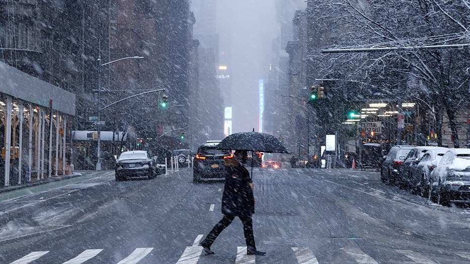 NEW YORK, NY - DECEMBER 14: A person walks across 7th Avenue in front of Times Square during a snowfall on December 14, 2025, in New York City. (Photo by Gary Hershorn/Getty Images)