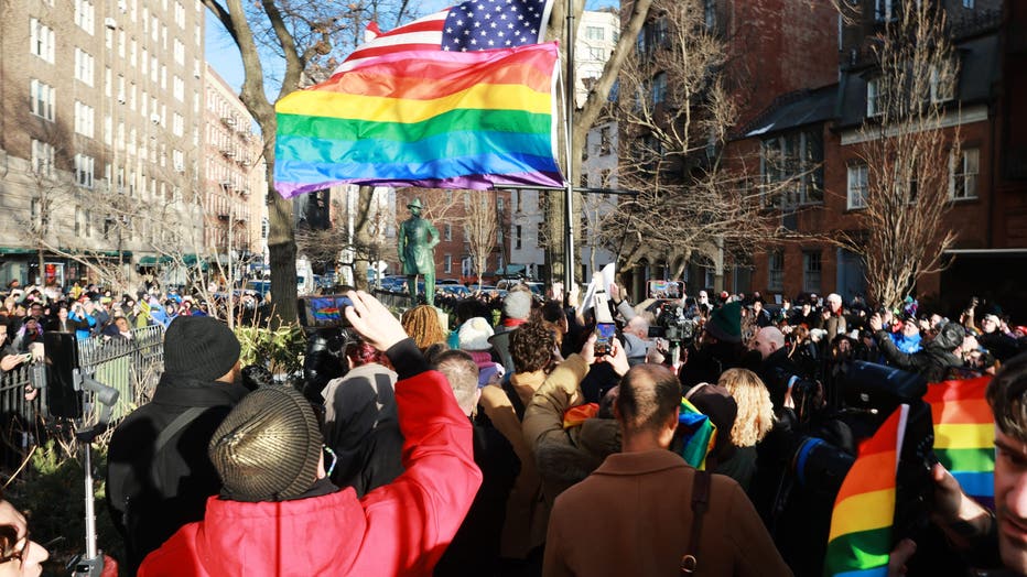 NEW YORK, NEW YORK - FEBRUARY 12: People watch as local politicians put up an LGBTQ+ Pride flag at the Stonewall National Monument after the Trump administration had the National Park Service remove it earlier in the week on February 12, 2026 in New