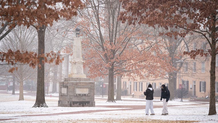 COLUMBIA, SOUTH CAROLINA - JANUARY 31: People explore the historic Horseshoe as snow falls at the University of South Carolina on January 31, 2026 in Columbia, South Carolina. Forecasts show much of the Carolinas blanketed with snow and unseasonably