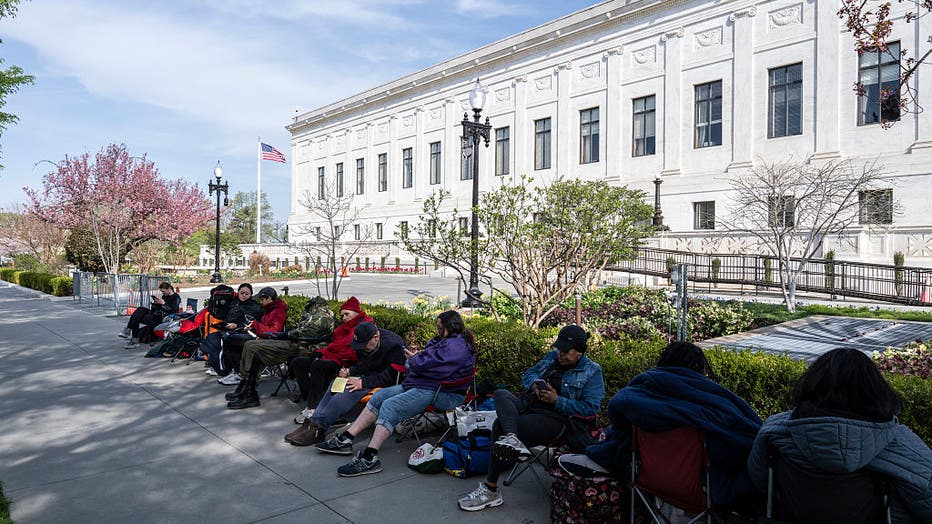 People wait in line outside the Supreme Court Justice building to attend oral arguments on birthright citizenship a day before the court is scheduled to address the case, on March 31, 2026 in Washington, D.C. The Supreme Court is set to convene on Ap