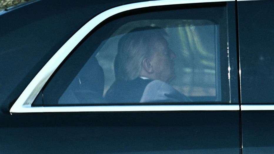 U.S. President Donald Trump rides in his motorcade as he departs the White House for the U.S. Supreme Court in Washington, D.C., on April 1, 2026. (Photo by Brendan SMIALOWSKI / AFP via Getty Images)