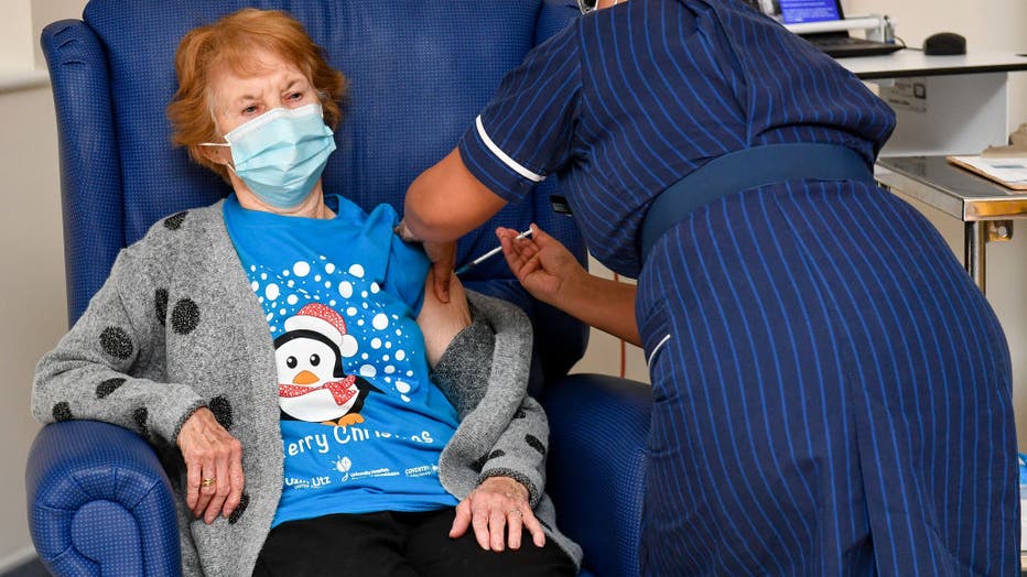 Nurse May Parsons (R) administers the Pfizer/BioNtech Covid-19 vaccine to Margaret Keenan (L), 90, at University Hospital in Coventry, central England, on December 8, 2020 making Keenan the first person to receive the vaccine in the country's biggest
