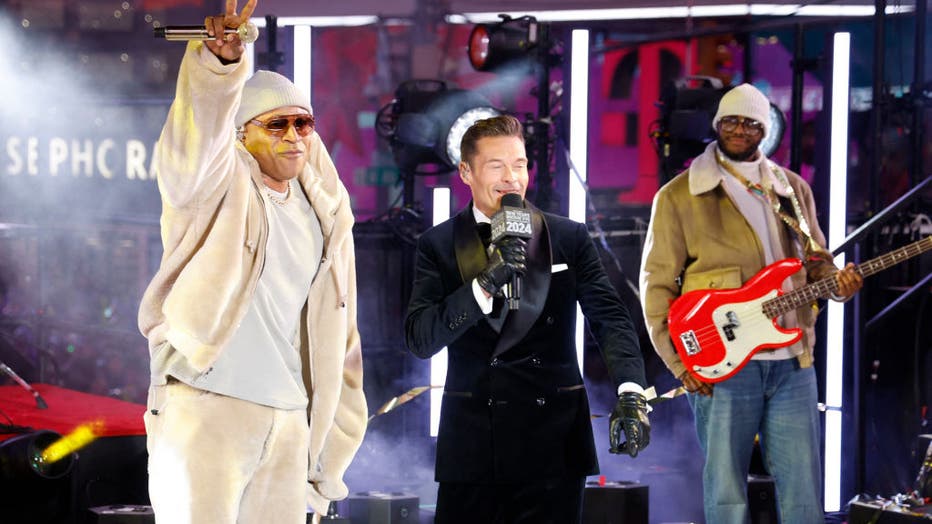 US rapper LL Cool J gestures next to speaks to media personality and game show host, Ryan Seacrest, after performing during the New Year's Eve celebration in Times Square on December 31, 2023, in New York City. (Photo by John LAMPARSKI / AFP) (Photo