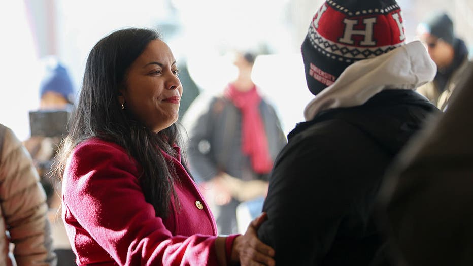 Analilia Mejia, US Democratic House candidate for New Jersey, greets voters outside the Montclair Municipal Building on the first day of early voting in Montclair, New Jersey, US, on Thursday, Jan. 29, 2026. Mejia is one of 11 Democrats vying to fill