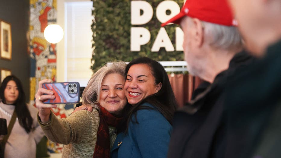 Analilia Mejia, US Democratic House candidate for New Jersey, center right, takes a photo at Paper Plane Coffee Co. in Montclair, New Jersey, US, on Thursday, Jan. 29, 2026. Mejia is one of 11 Democrats vying to fill the House seat vacated by Mikie S