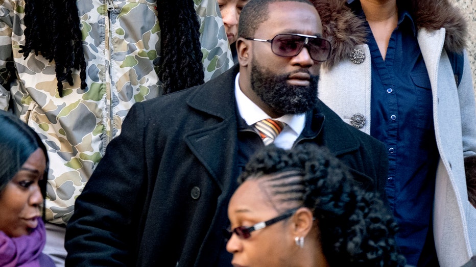 Michael Thomas, a federal jail guard responsible for monitoring Jeffrey Epstein the night he killed himself, leaves federal court Monday Nov. 25, 2019, in New York. He faces charges for falsifying prison records in the hours surrounding Epstein's dea