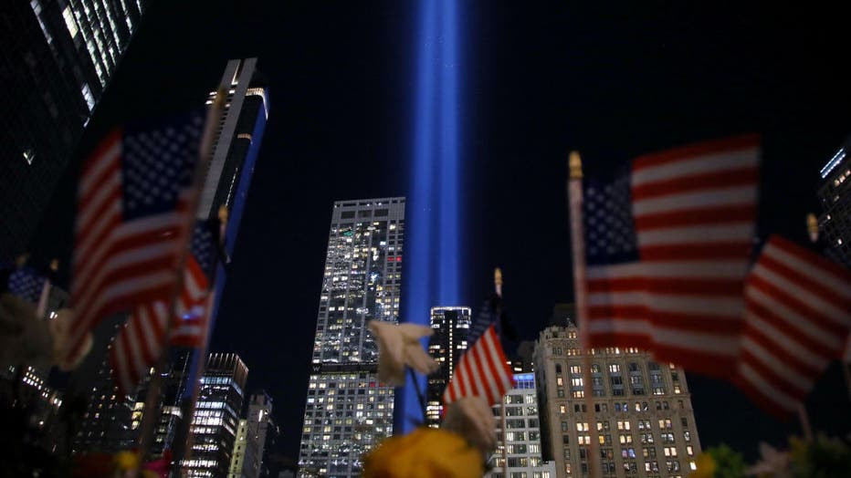 NEW YORK, NY - SEPTEMBER 11: The annual Tribute in Light is illuminated over the skyline of lower Manhattan on the 23rd anniversary of the 9/11 attacks on the World Trade Center on September 11, 2024, in New York City. (Photo by Gary Hershorn/Getty I
